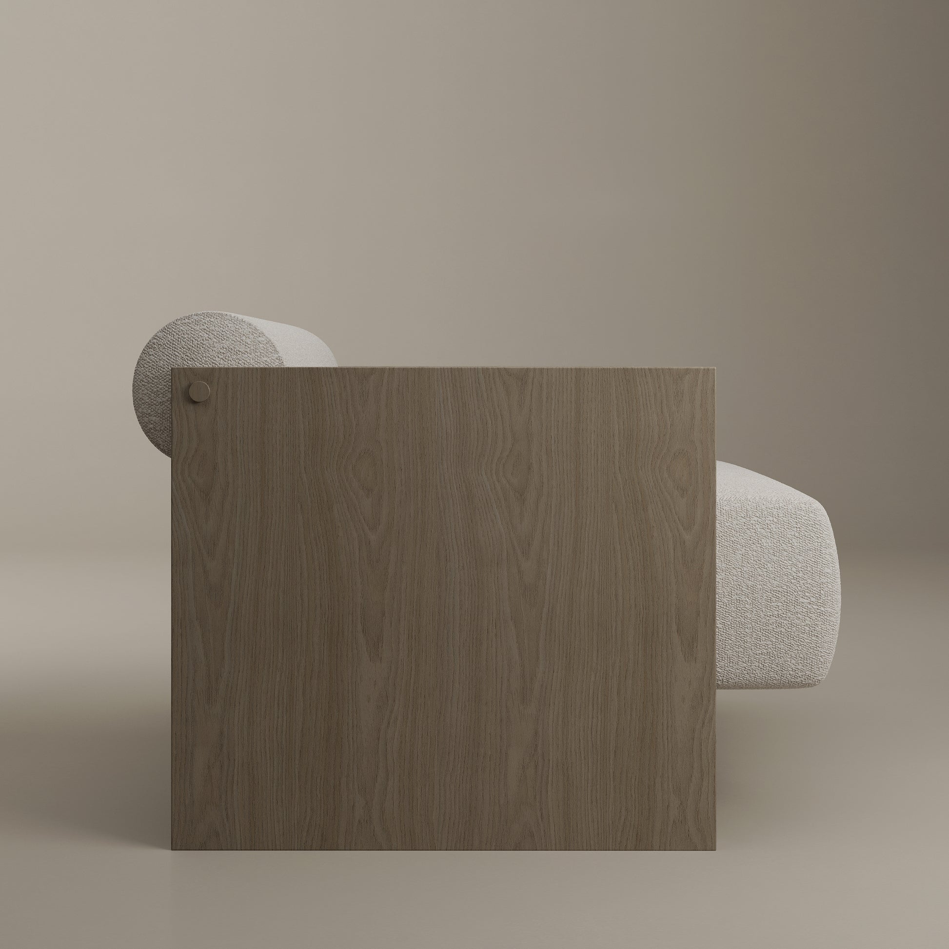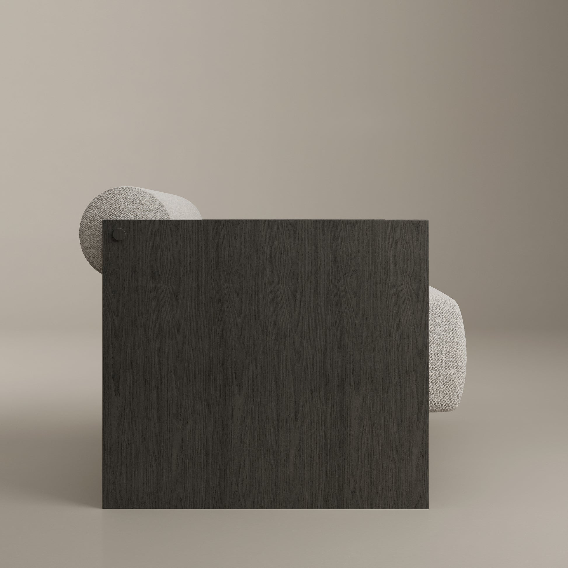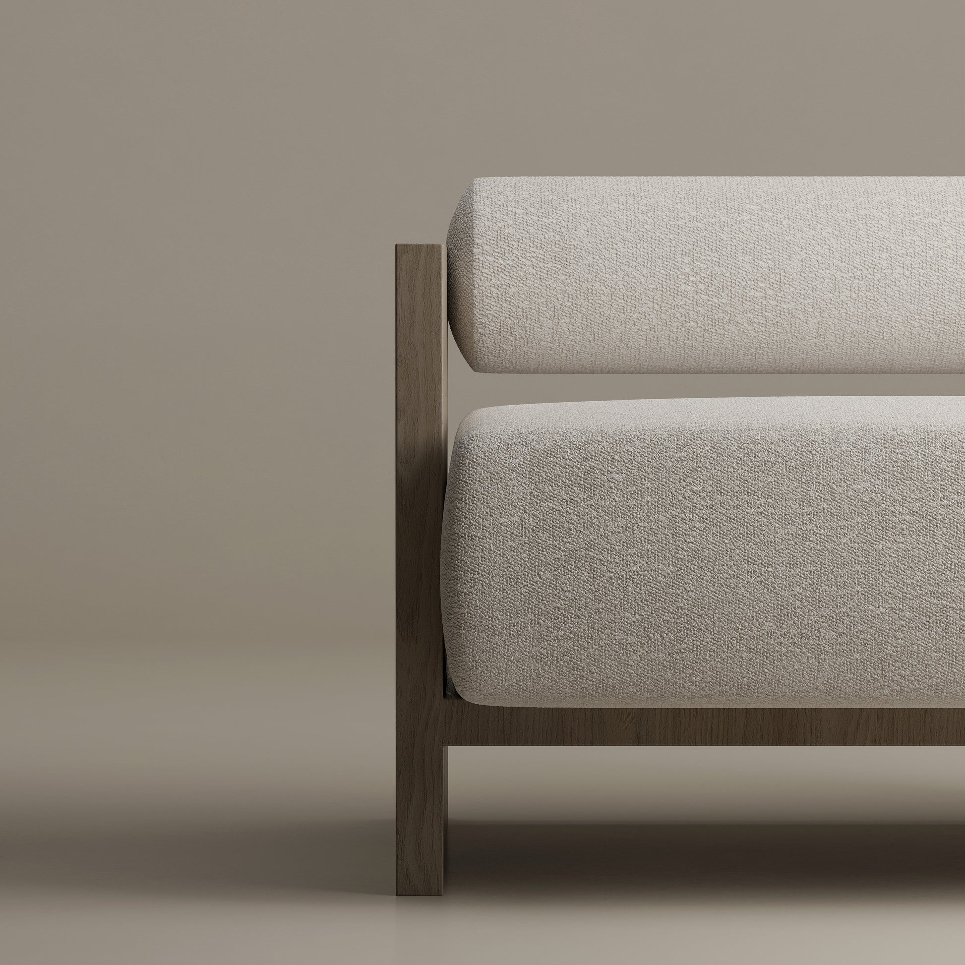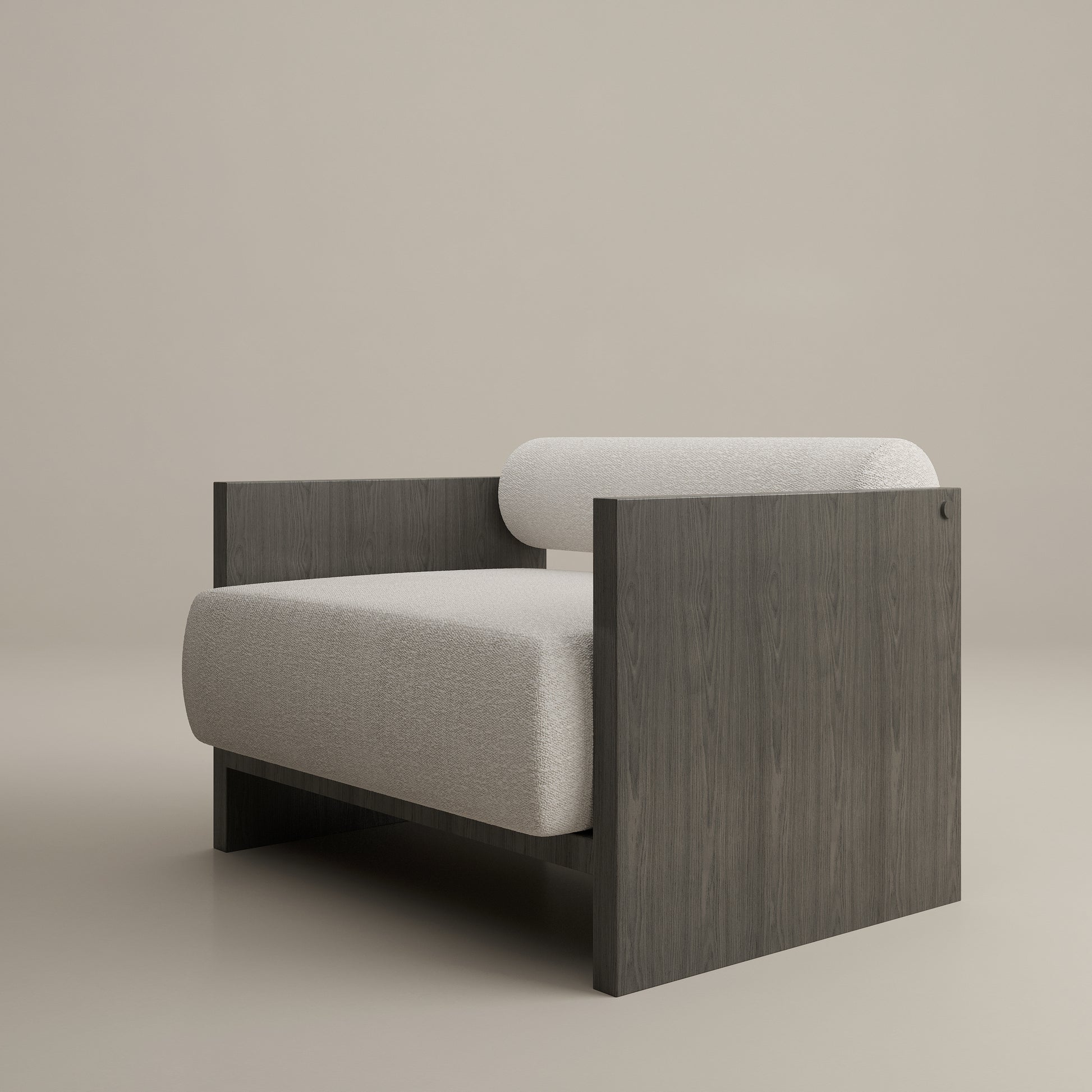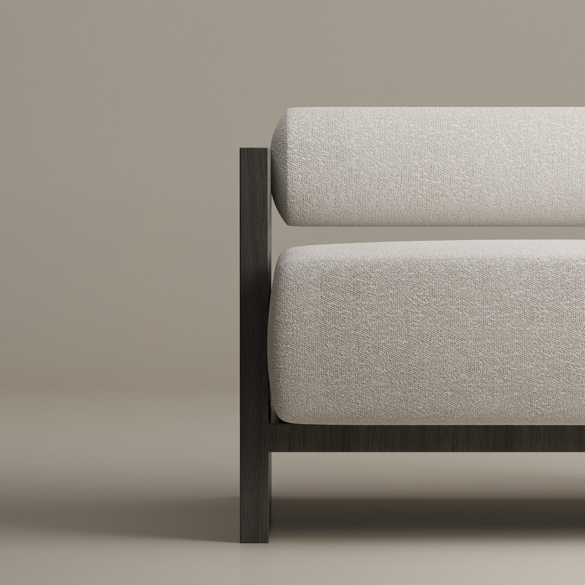 This sculptural armchair is defined by a rigid timber structure interrupted by the softens of a cylindrical backrest suspended above a thick seat.